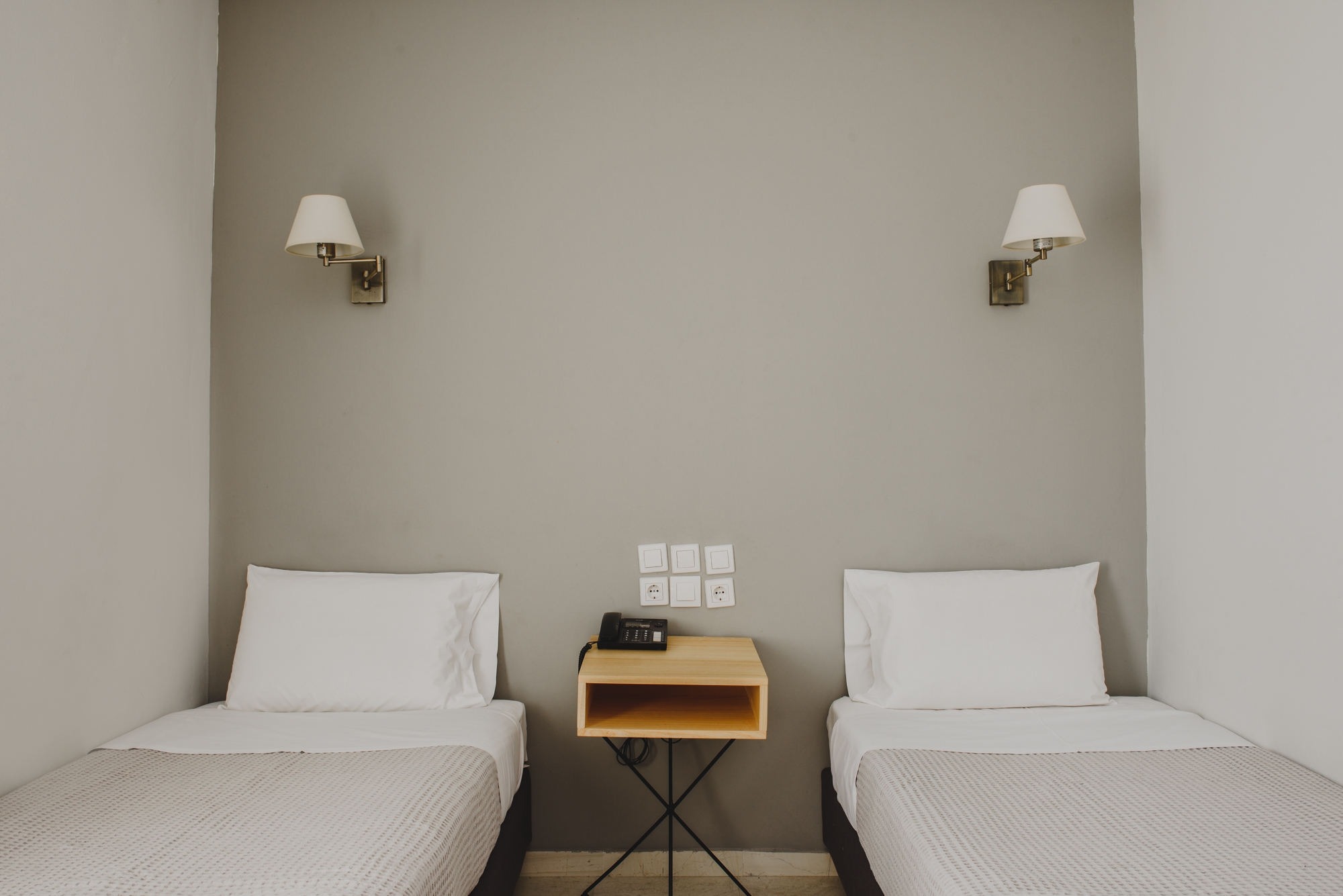 Δίκλινο δωμάτιο με λιτή διακόσμηση, πλήρως εξοπλισμένο με μπαλκόνι και θέα στον κήπο / βουνό. Περιλαμβάνει δύο μονά κρεβάτια με ανατομικό στρώμα και όλες τις παροχές για μια άνετη και ξεκούραστη διαμονή.